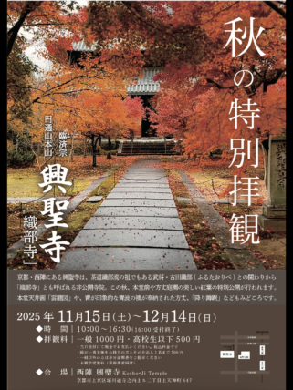 期間:2025年11月15日(土)〜12月14日(日)時間:10:00〜16:30(受付終了 16:00)拝観料:一般 1,000円/高校生以下 500円 普段は非公開の興聖寺ですが、期間中は紅葉に彩られた美しい庭園をは