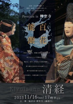 興聖寺(織部寺)で11月15日(日)から始まる特別拝観に合わせて、春に続き秋にもまたまた能楽イベント「百花能蘭Premium」を開催いたします。 百花能蘭 Premium「清経」日 時:11月16日(日)時 間:17時半
