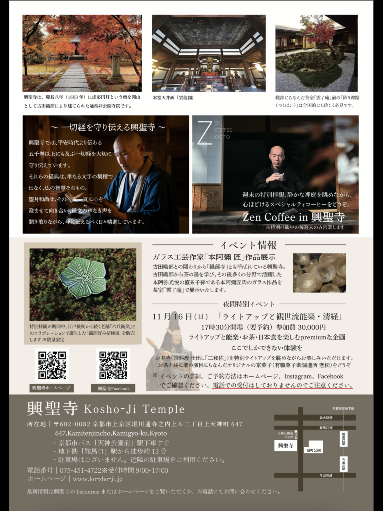 今回の特別拝観では、週末限定でスペシャルティコーヒーをお楽しみいただけるほか、古田織部に茶の湯を学び、その後多方面で活躍した本阿弥光悦の直系子孫・本阿彌匠氏による作品展示も行います。