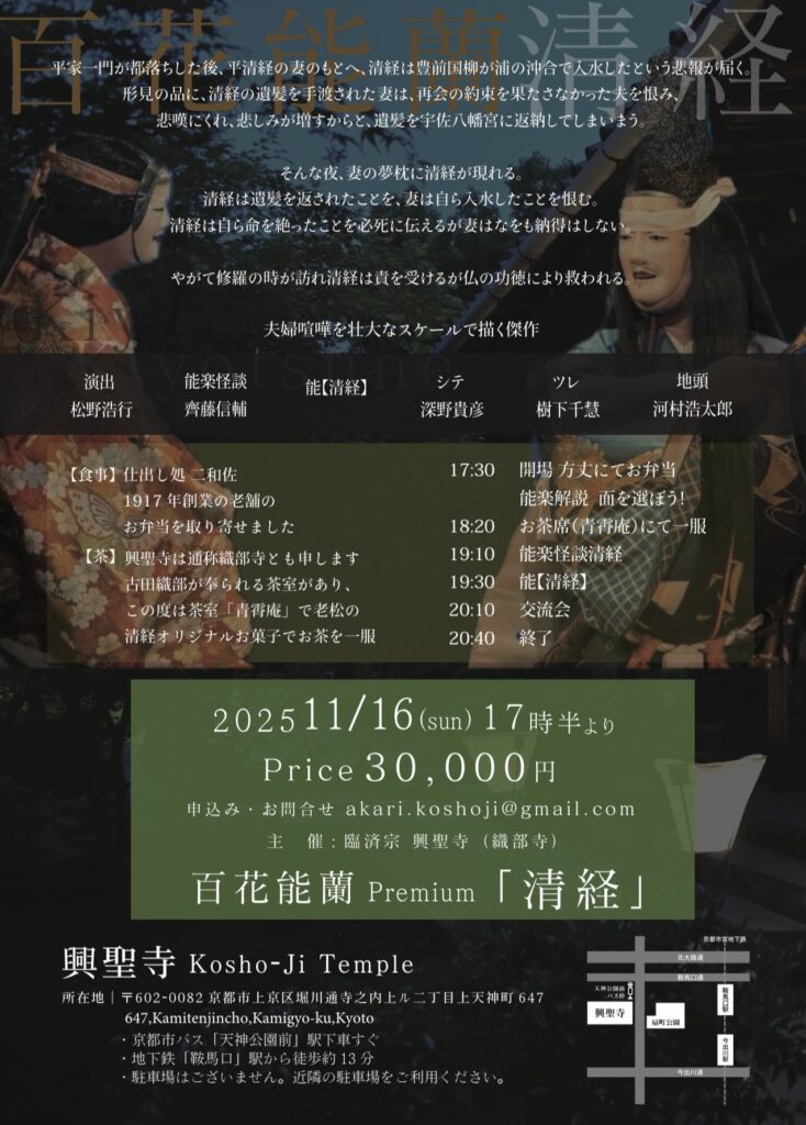 興聖寺(織部寺)で11月15日(日)から始まる特別拝観に合わせて、春に続き秋にもまたまた能楽イベント「百花能蘭Premium」を開催いたします。